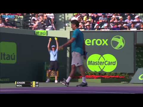 Rafael Nadal opened his challenge to win the Miami Masters 1000 tournament for the first time with a win over compatriot Nicolas Almagro in straight sets. This is one Masters title missing from his trophy cabinet and he surely wants to have his trademark bite of it soon. Rafa looked sharp in testing conditions, with strong gusty winds blowing throughout the game. I'm glad Rafa showed no signs of being tentative as a result of his freak incident during practice a couple of days ago. He was very committed to his usual aggressive style and played quite a few Nadal-esque points in this match. Below is one such point from the game. Enjoy it... Rrrrrafa style! Vamos!